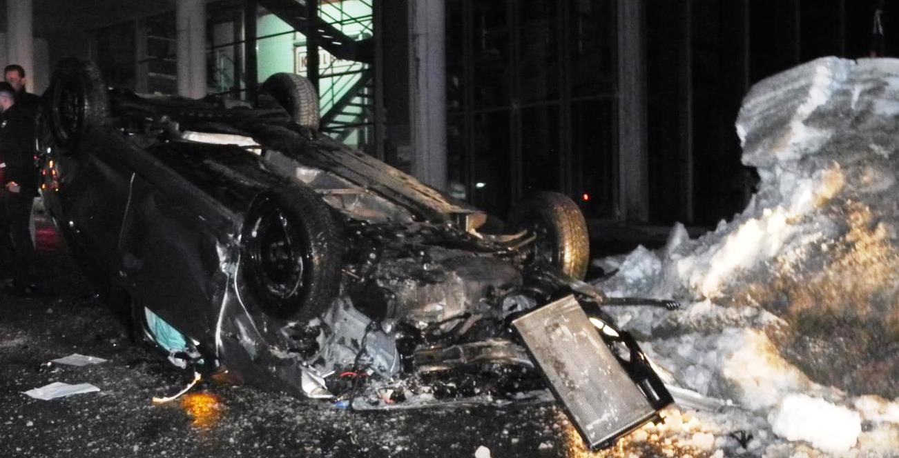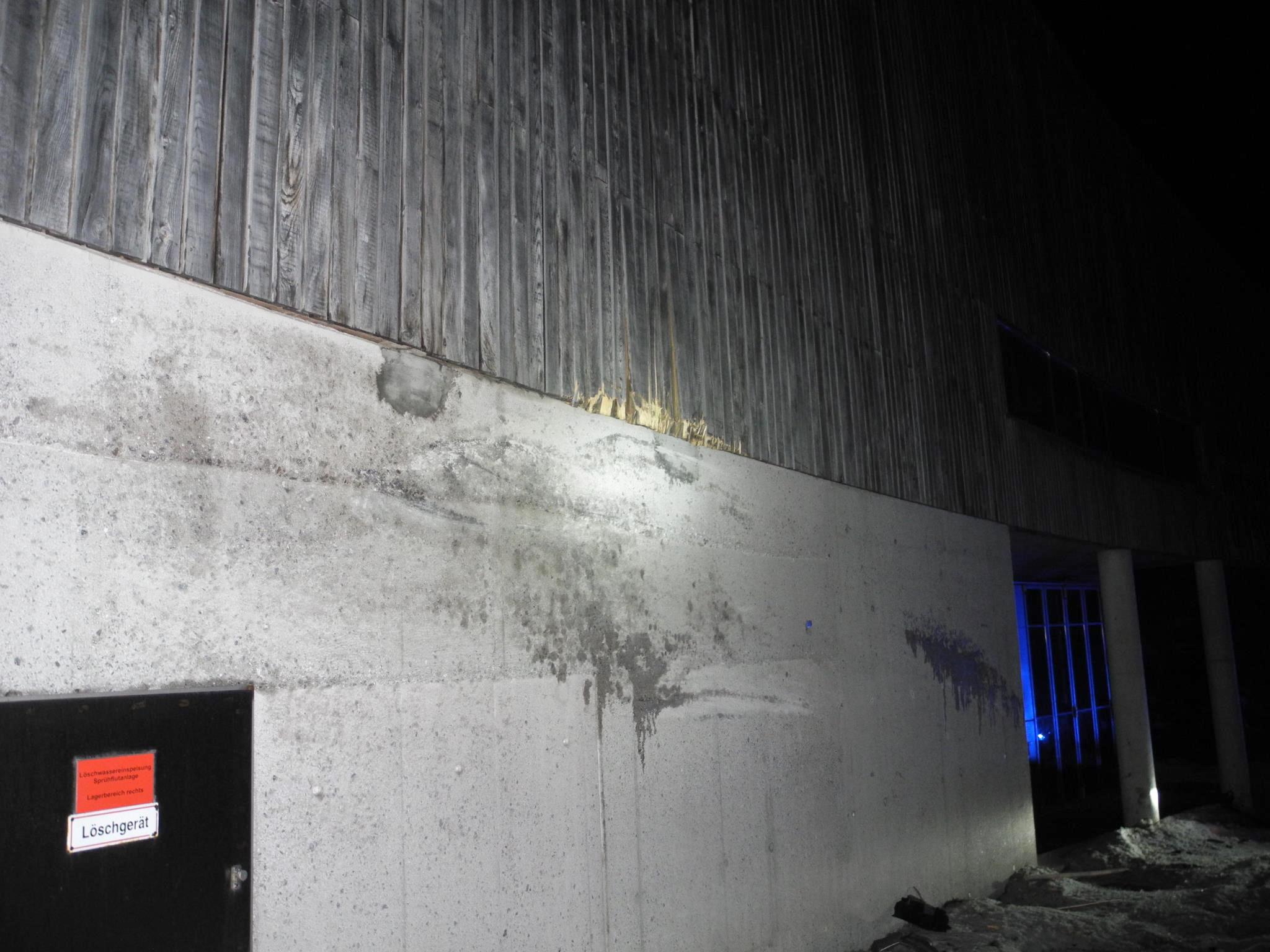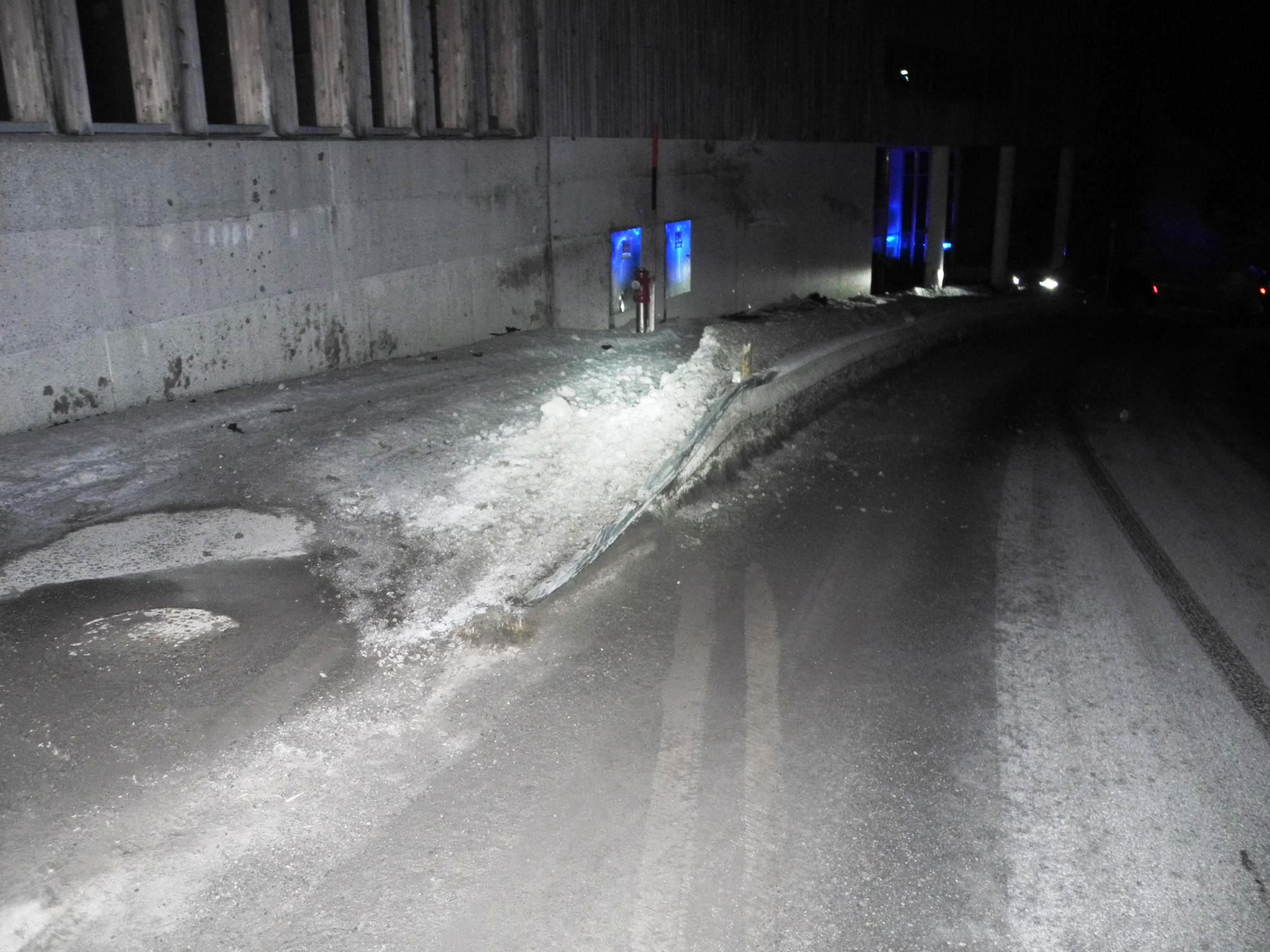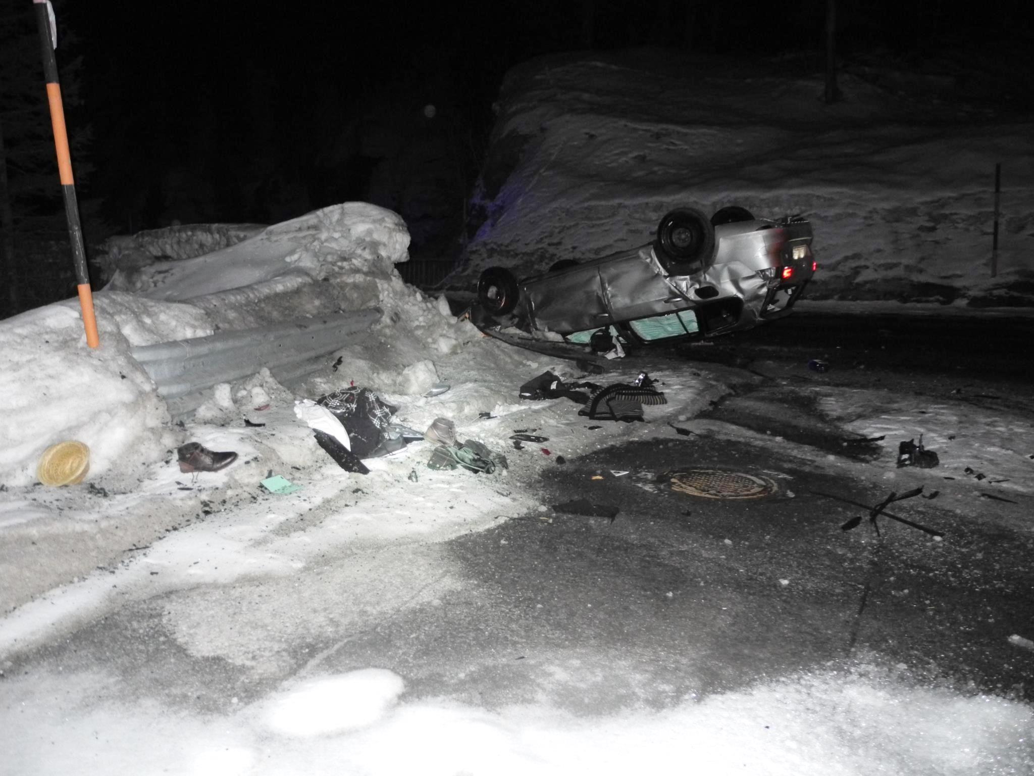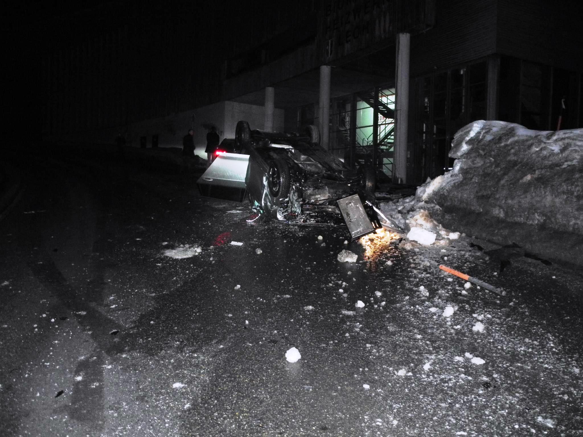 Vor Ort eingetroffen zeigte sich, dass der Unfall ein sehr spektakulärer war. In der Kurve des Heizwerks Richtung Lech war der Fahrer auf die Gegenfahrbahn gekommen, nahm die beginnende Leitplanke als Aufstiegshilfe, kollidierte in einiger Höhe mit dem Heizwerk und kam auf dem Dach zu liegen.