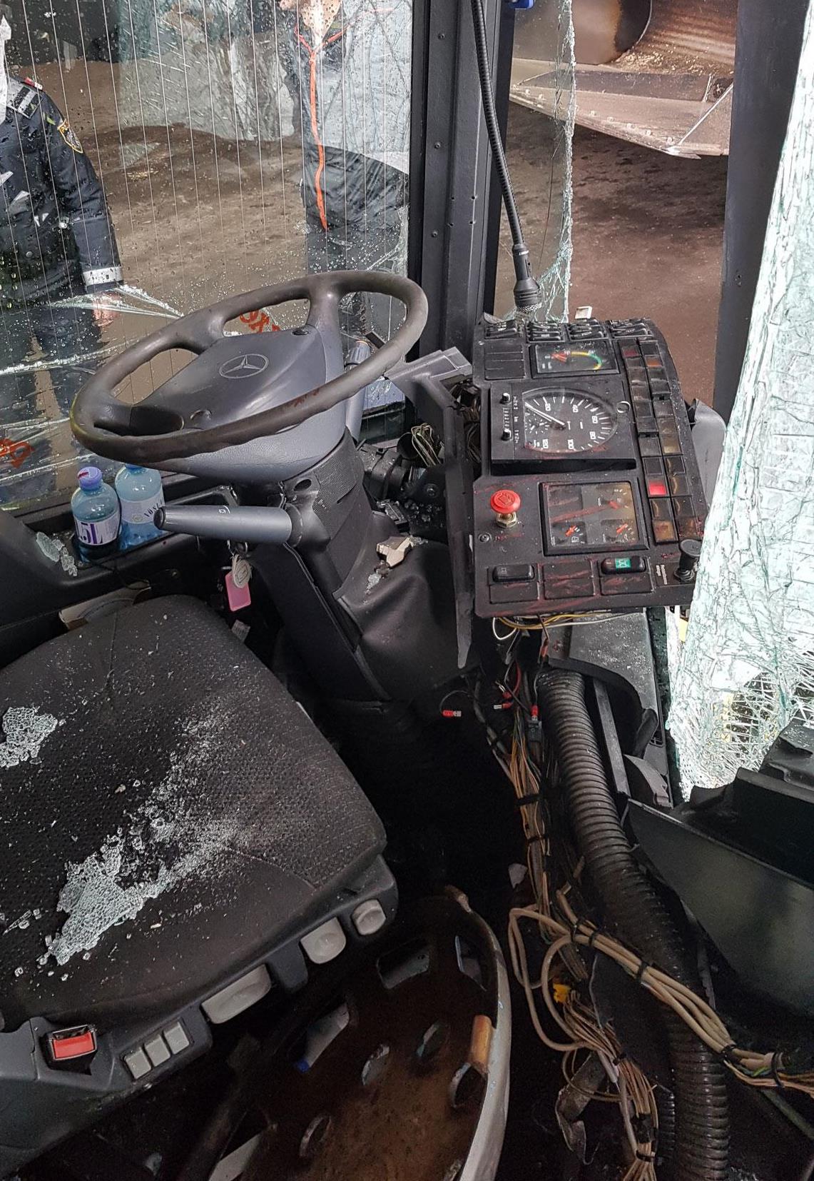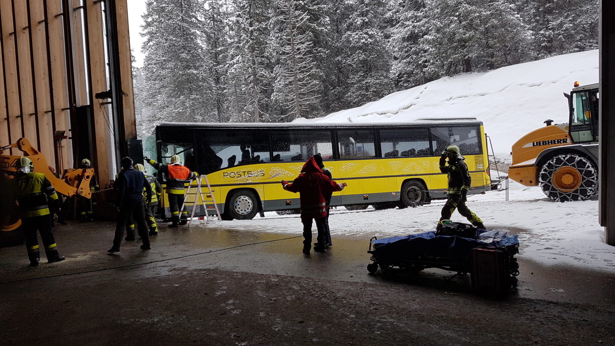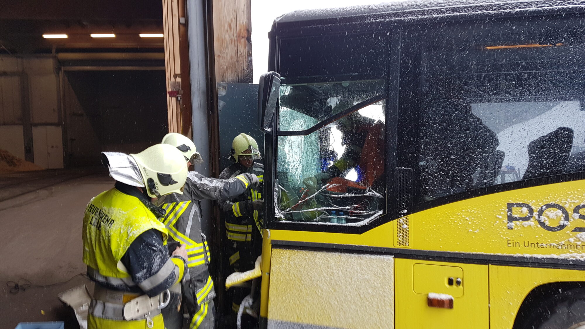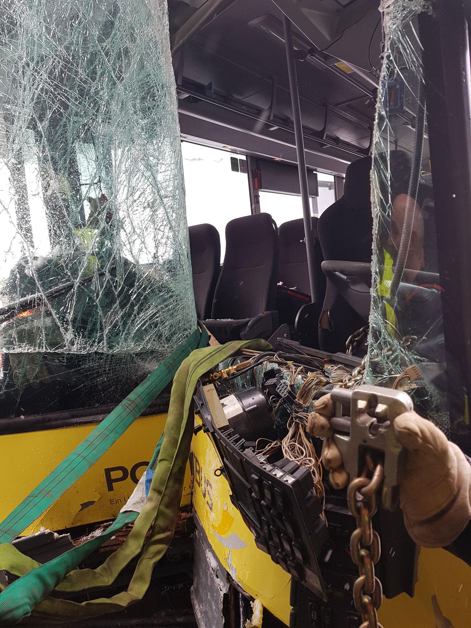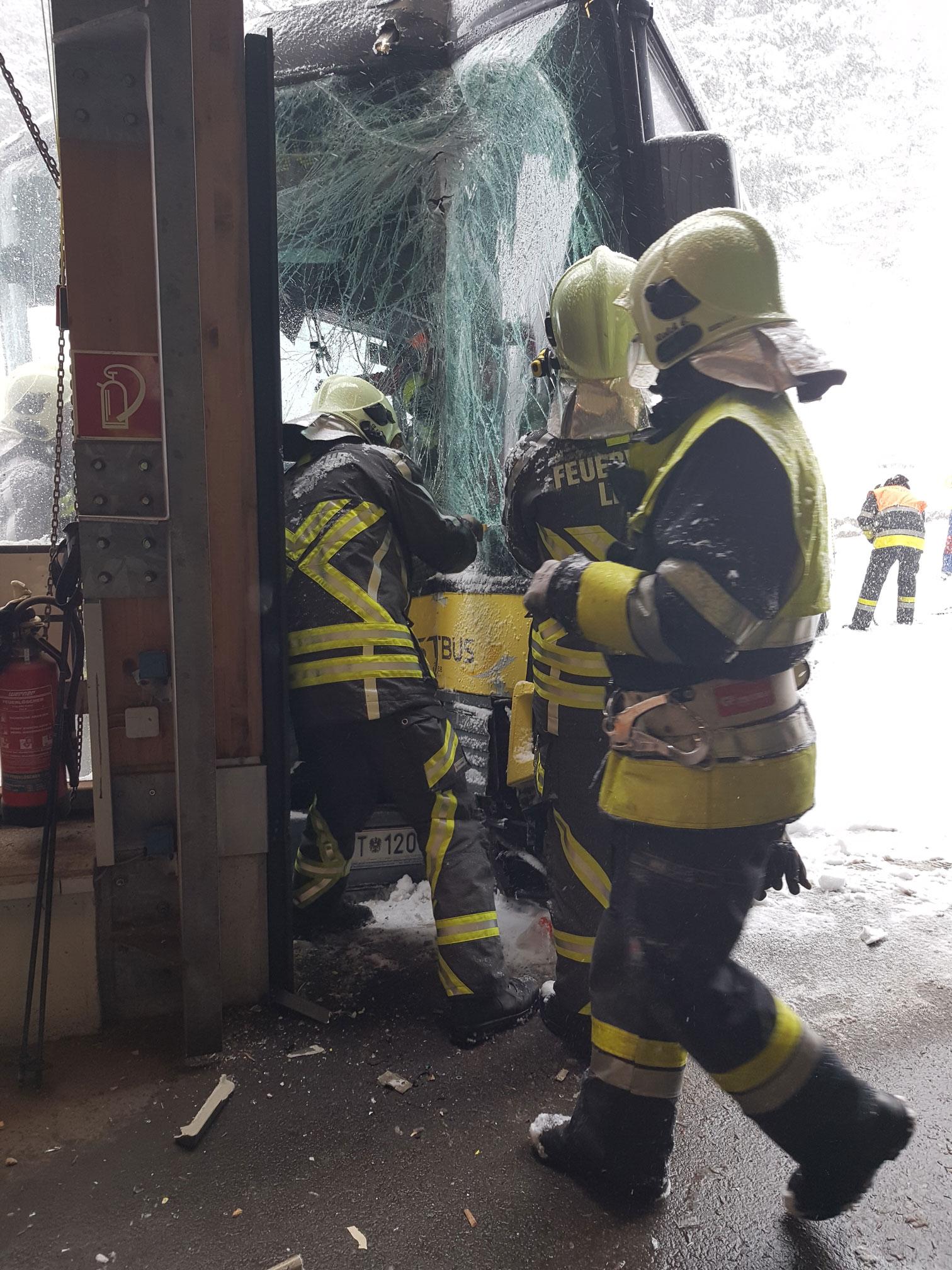 Beim Aufprall wurde der Lenker des ansonsten leeren Busses mit den Beinen eingeklemmt. Die OF Lech sicherte den Bus gegen Abrutschen und machte sich dann mit hydraulischem Gerät an die Befreiung des Fahrers.