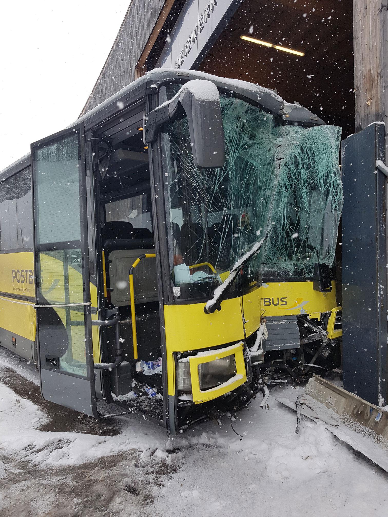 Ein Postbus war talwärts in Richtung Lech unterwegs, kam von der Fahrbahn ab und prallte gegen das geöffnete Tor des Heizwerks Lech. Dies geschah nur ein wenige Meter oberhalb der Stelle, wo vorgestern der PKW verunglückte.