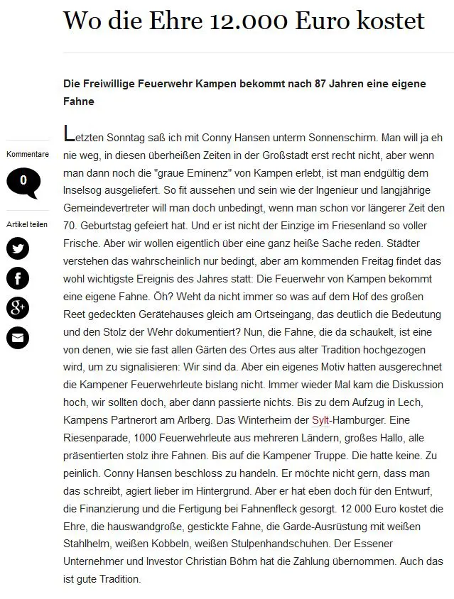 In der Welt am Sonntag und der Onlineausgabe war zu lesen, warum die Kampener jetzt erst eine eigene Fahne bekommen.