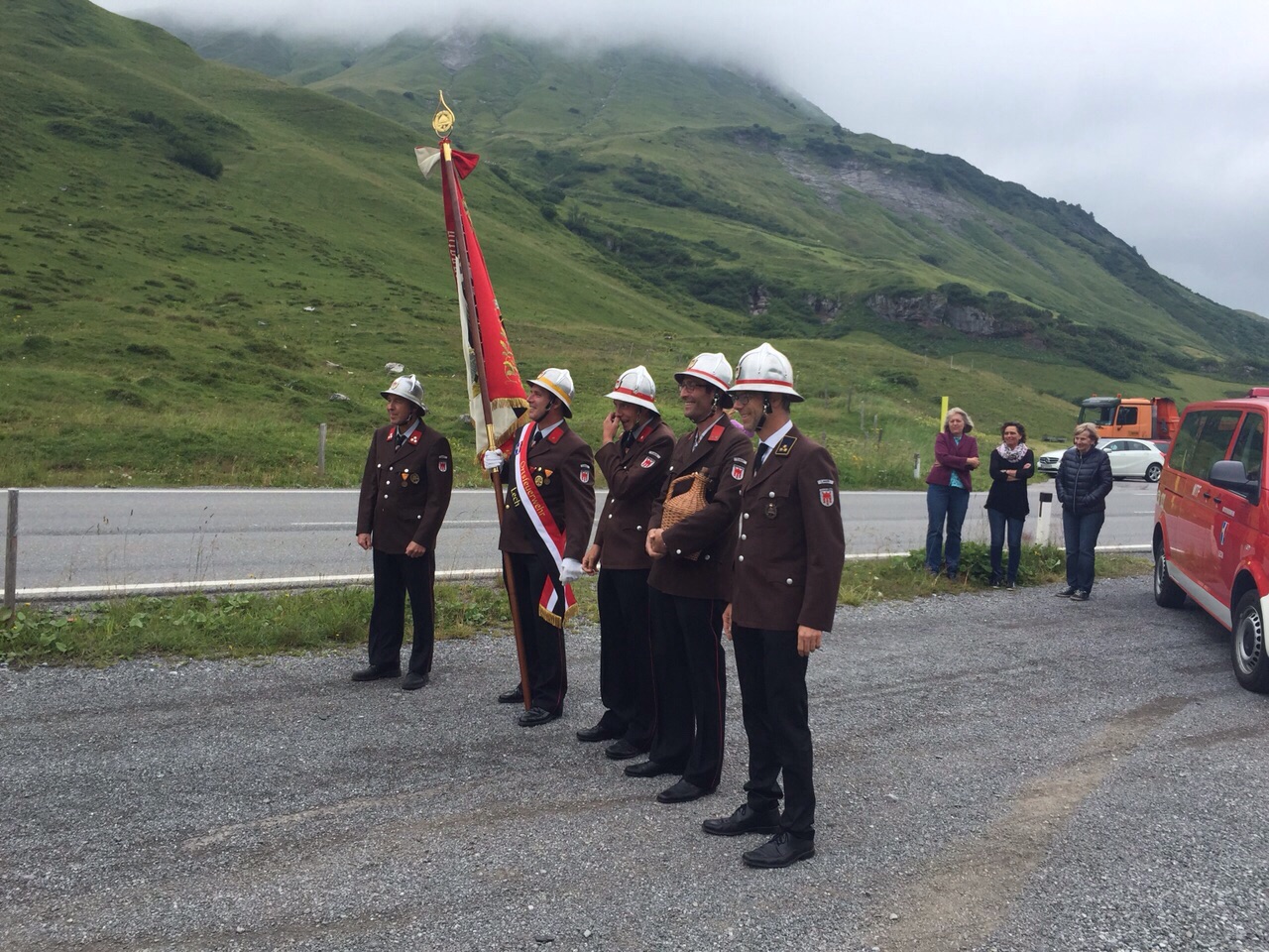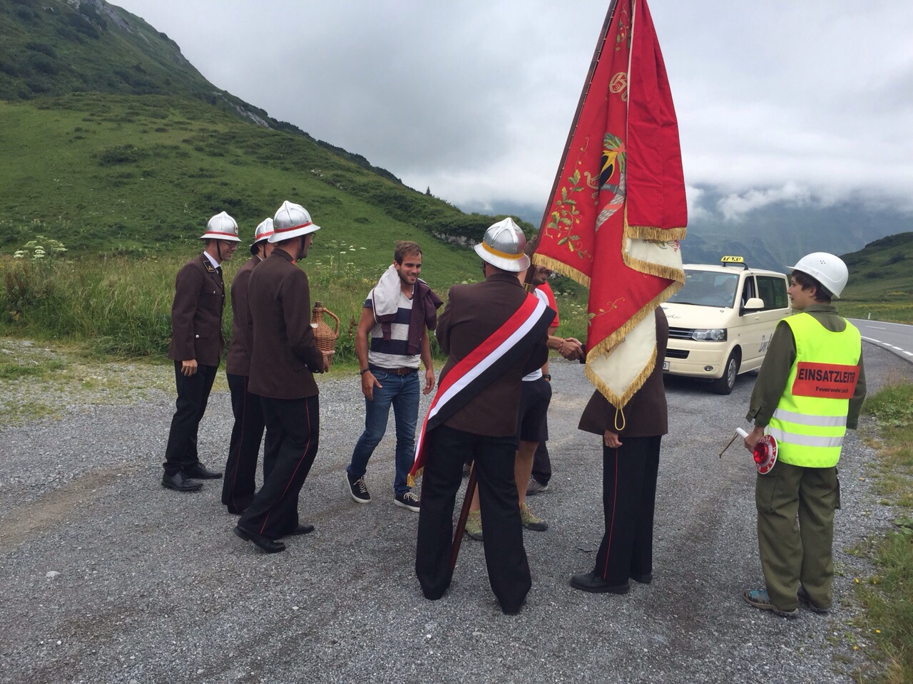 Die Ankunft der Fahrer in heimischen Gefilden war Grund genug, mit einem kleinen Begrüßungskomitee am Flexenpass auf sie zu warten und sie standesgemäß in der Heimat zu begrüßen – bei herrlichstem Sommerwetter, wie man sieht. Und mit Korbschnaps.