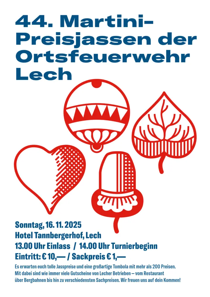 Am Sonntag den 16. November findet das traditionelle Preisjassen der Ortsfeuerwehr Lech statt. Es erwarten euch tolle Jass- und Tombolapreise und ein rundum gemütlicher Nachmittag mit Bur, Nell, Ass.