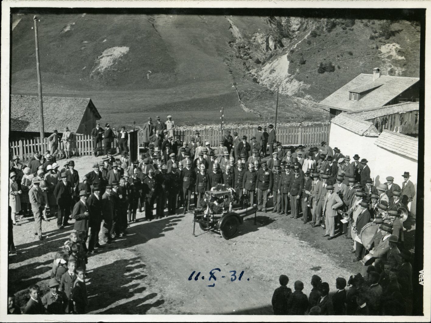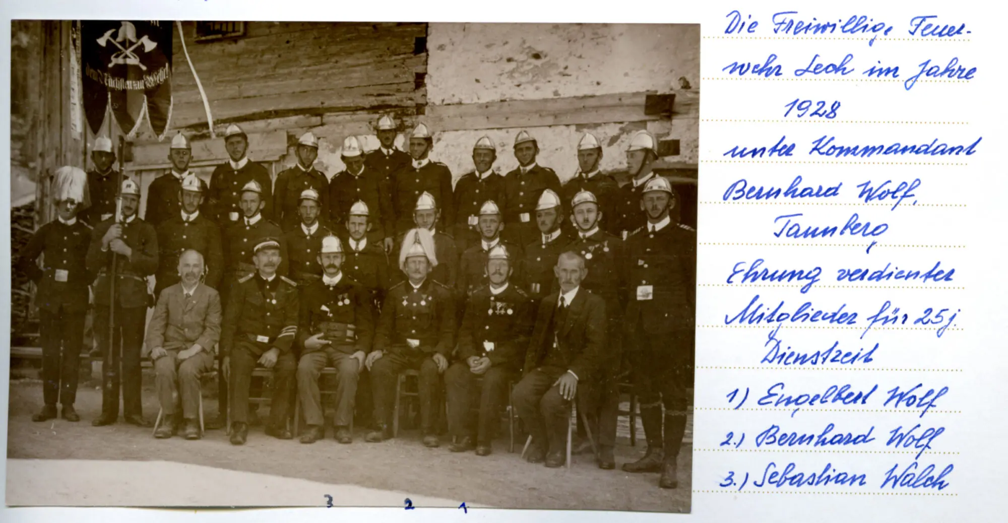 Auf dem ersten Bild sieht man das erste Gerätehaus der OF Lech auf dem jetzigen Strolz Areal im Dorfzentrum erbaut 1930. Vor allem der Schlauchturm ist gut zu erkennen. In diesem ersten Gerätehaus wurden die spärlichen Geräte der damaligen Zeit aufgewahrt. So bestand die Ausrüstung der OF Lech bis zum Jahr 1931 aus einer Handpumpe, die von sechs Männern bedient werden muste, 800m Schlauchmaterial sowie einem Strahlrohr. Im August 1931 wurde dann eine Motorspritze angeschafft, welche mit einem Fest am Kirchplatz eingeweiht wurde. In den kann man erkennen, dass die damalige Wehr schon viele Mitglieder hatte.